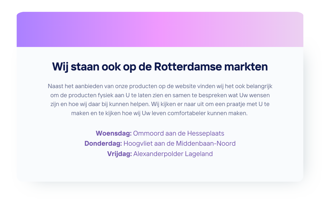 Vergeet het gedoe van winkels en lange zoektochten. Wij brengen het assortiment rollators en hulpmiddelen naar u toe, zodat u in uw vertrouwde omgeving kunt beslissen. Ervaar het gemak van proeflopen in uw eigen huis en ontdek welke oplossing het beste bij u past.