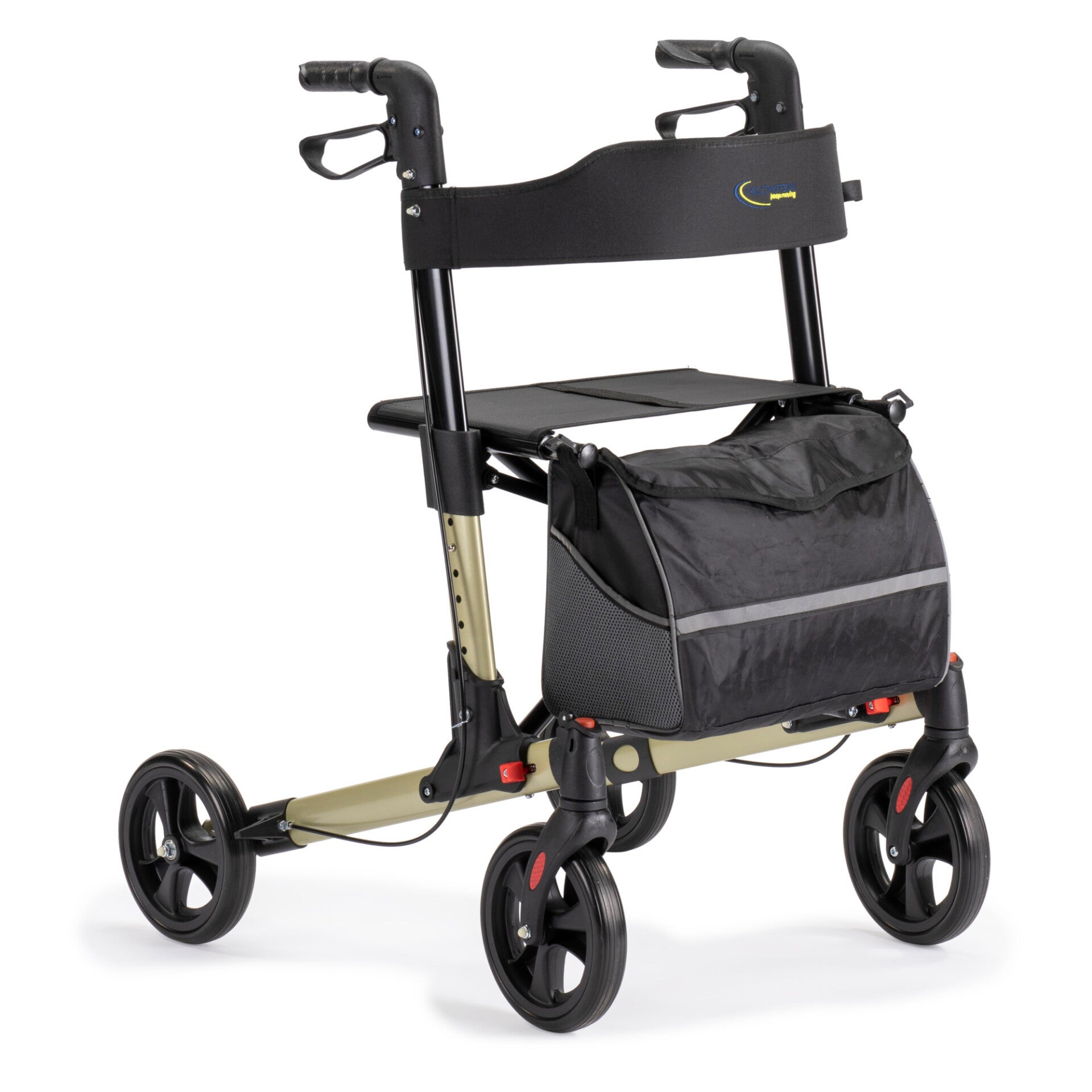 De MultiMotion Double is een dubbel opvouwbare, lichtgewicht rollator. Met 1 eenvoudige handbeweging is de rollator in de breedte samen te vouwen. Wanneer deze is opgevouwen kan de rollator nog verder worden verkleind door de klemmen aan het frame in te drukken en het frame naar u toe te klappen. Zo heeft u een klein pakketje en past de MultiMotion Double rollator in iedere auto. Deze aluminium rollator is standaard voorzien van handremmen met een parkeerrem. Ook is hij voorzien van een stevige zitting en een rugband waardoor men comfortabel kan zitten op de rollator. Standaard wordt deze rollator geleverd met een kleine, gesloten tas. Hij is beschikbaar in de kleur antraciet, zilver, wit, champagne en rood.