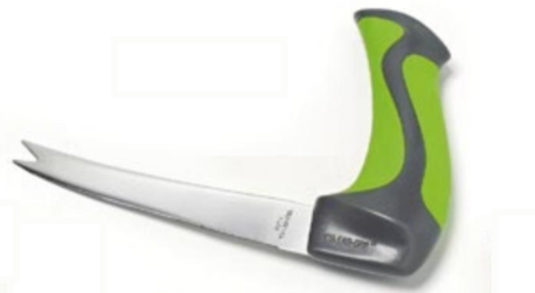 Keukenmessen niet een comfortabel gehoekt handvat. Voorzien van zacht anti-slip materioal wat gemarkeerd is met een felgroene kleur. De hoek van het handvat is 90° en houdt hand en pols in een natuurlijke positie. Lichtgewicht, en gemaakt van roestvrijstacil.