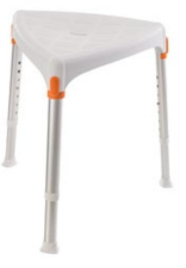 Deze driehoekige douchekruk is verkrijgbaar in een vaste (43 cm) en verstelbare hoogte (39 — 54 cm).