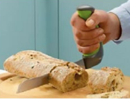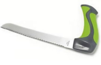 Keukenmessen niet een comfortabel gehoekt handvat. Voorzien van zacht anti-slip materioal wat gemarkeerd is met een felgroene kleur. De hoek van het handvat is 90° en houdt hand en pols in een natuurlijke positie. Lichtgewicht, en gemaakt van roestvrijstacil.