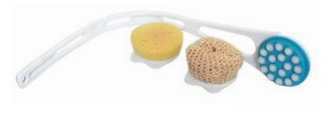 Multifunctionele set voor huid-verzorging met drie verschillende opzetstukken; lotion/crème verdeler, badspons en schrub-spons. Door de gebogen steel is elk lichaamsdeel te bereiken. De steel bestaat uit drie delen, is variabel in lengte te gebruiken en makkelijk mee te nemen.