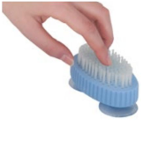 Schrobben met één hand. Zeer geschikt om nagels of kunstgebit te reinigen. De rubberen zuignappen zorgen dat de borstel op de meeste oppervlakken blijft zitten.