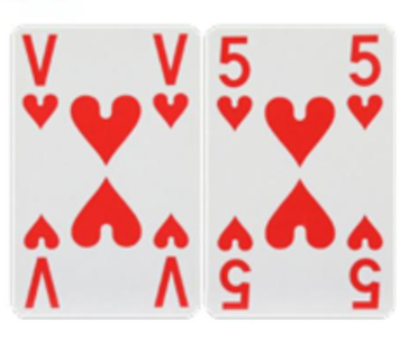 Normaal formaat speelkaarten met grote cijfers en letters. Type Jumbo is voorzien van afbeeldingen, type extra visible heeft geen afbeeldingen. Twee sets van 52 kaarten en 2 jokers.